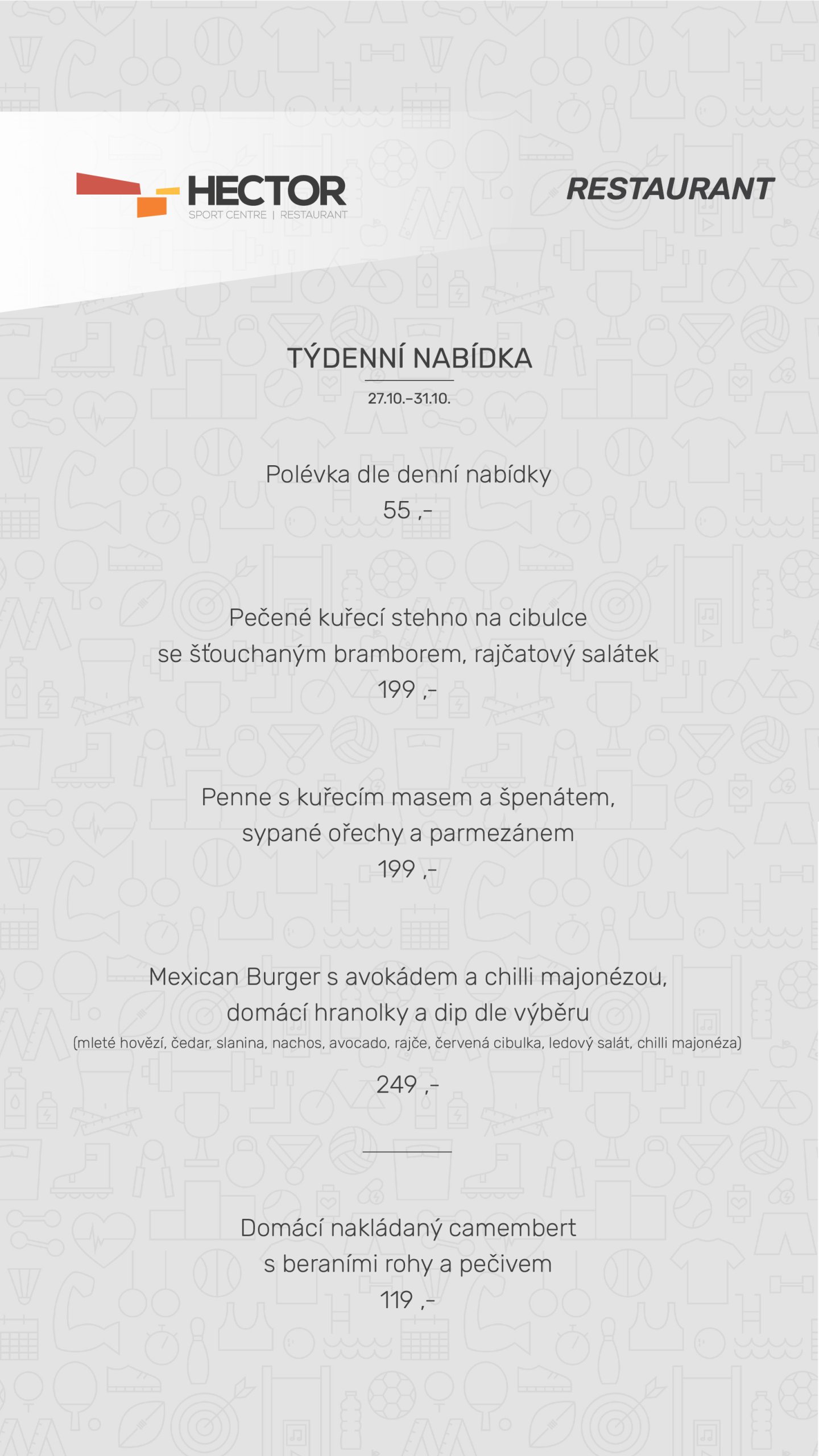 Ve všední dny nabízíme sezonní týdenní nabídku. V restauraci dbáme na výběr kvalitních surovin, velké porce a svěží nápoje. Jídelní lístek nabízí osvědčené kulinářské kombinace. Pochutnat si můžete také při projekcích sportovních přenosů (fotbal, hokej, olympijské hry apod.). Sledujte náš facebook.